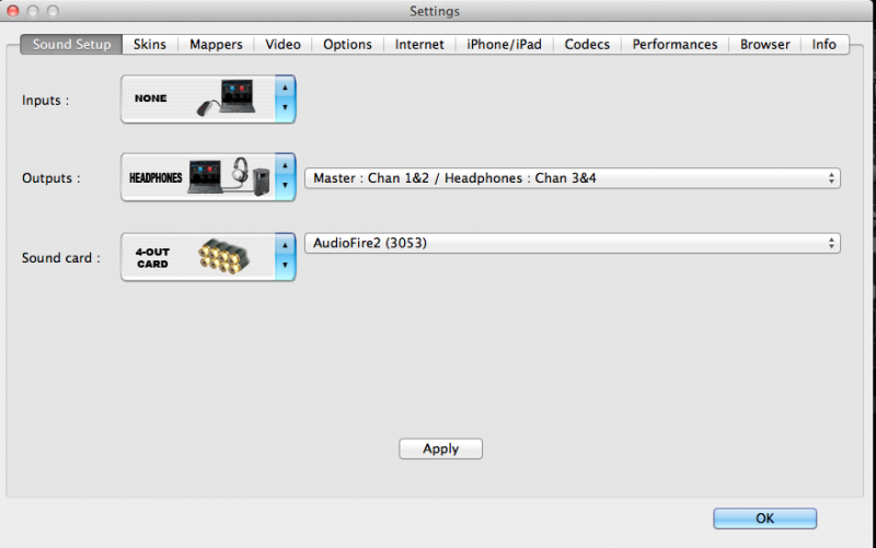 Hello all, just bought latest MacBook Pro and Echo Audiofire 2 as its external sound card. I'm using as well latest version of VDJ all this with an external mixer (Pioneer DJM 300). Don't know why but I can not manage to have deck 1 sound independent from deck 2 sound and deck 2 sound independent from deck 1 sound. I hear song in deck 1 also in deck 2 and song in deck also in deck 1. The are not separated one from the other. Have set up Audiofire's Midi configuration as multichannel and quadrophonic.
