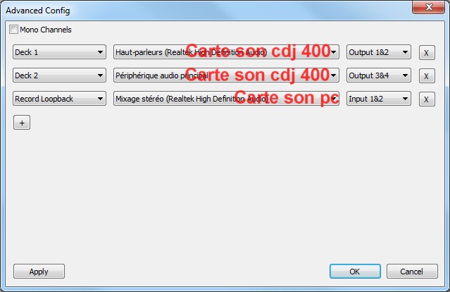 Va dans la configuration audio de vdj, clique sur la flèche Entrées --> Avanced config, et configure comme c'est indiqué sur l'image.