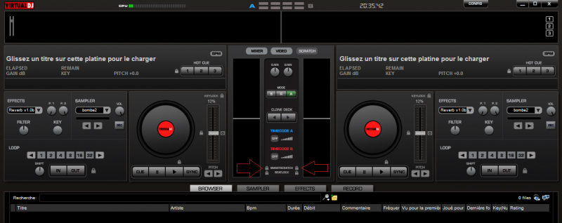 au dessus de la table de mix de vdj (skin d'origine installé avec vdj) il y a 3 onglet [mixer] [vidéo] [scratch] clic sur le scratch ensuite il faut tout simplement désactivé smartschratch (petit cadenas [ flèche rouge sur l'image du dessus ] , si le cadenas et gris le smartschratch est desactivé, orange foncé veut dire qu'il est activé)