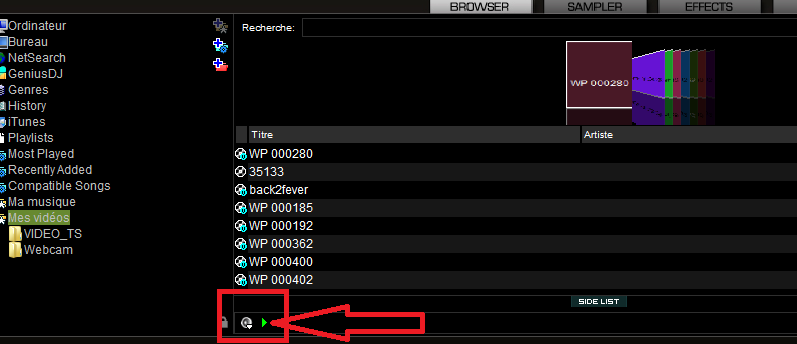 Il suffit de mettre en surbrillance le morceau que vous souhaitez pré écouter et de cliquer sur la petite flèche verte :