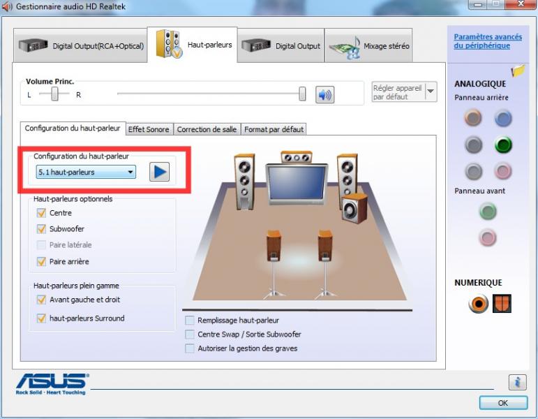 voila deux exemples pour configuré la carte son de l'ordi (4ch haut-parleur, 5ch haut-parleur etc..)