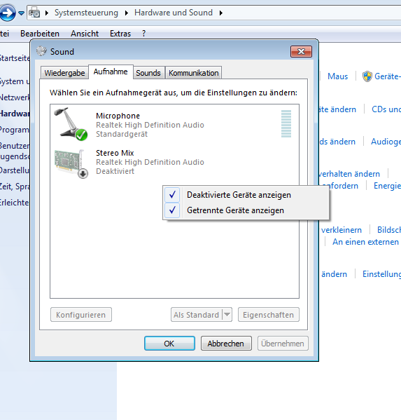 Mir wird dort nur mein Mikrofon angezeigt. Den Haken bei "Deaktivierte Geräte anzeigen" habe ich gesetzt.