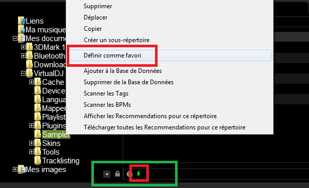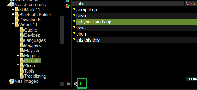 Possibilité 2 est de vous rendre avec le browser dans le répertoire que j'ai indiqué pour les samples et de cliquer dessus pour le mettre en surbrillance et ensuite utiliser le mode pré écoute de VirtualDJ