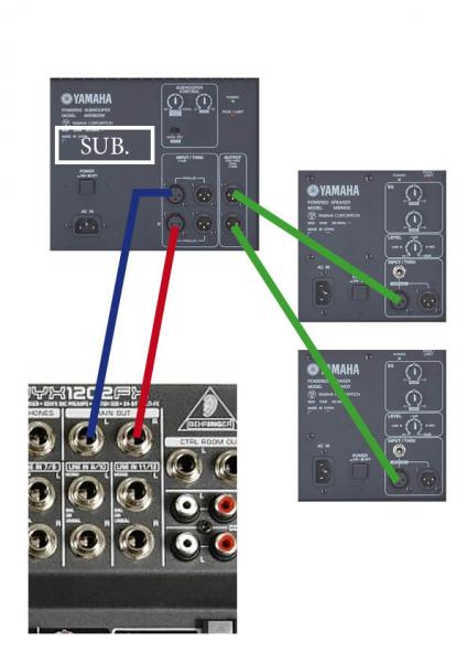 Normalement il faut que tu branché ton sub sur le mixeur , et ensuite tu branche les enceinte sur le sub