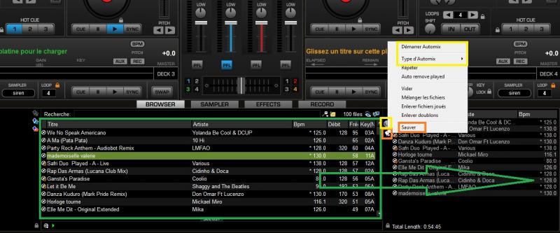 Pour démarrer l'automixe soit vous cliquez sur le rond "JAUNE" ou vous cliquez sur "Démarrer AutoMixe" (voir carré jaune)