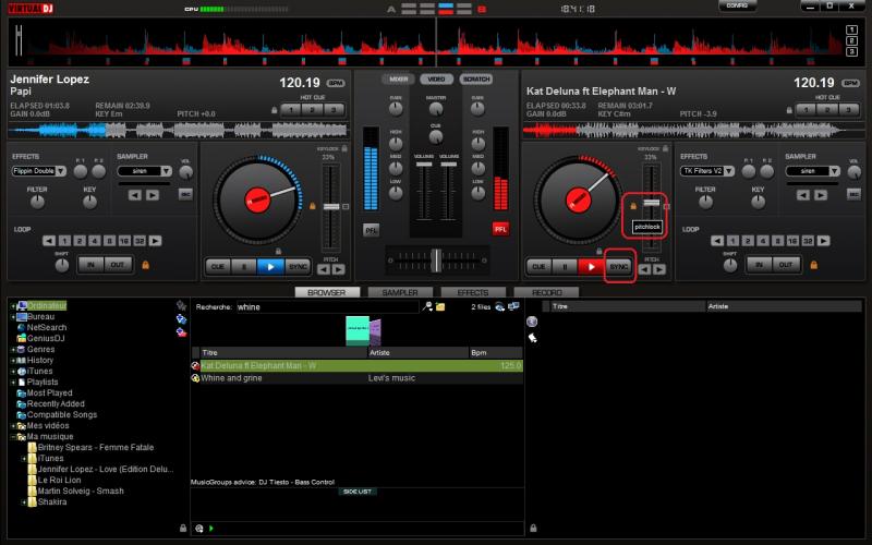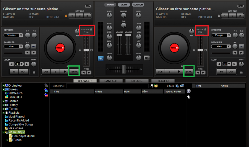 Voir image suivante en rouge ou cliquer sur le petit cadenas pour le KEYLOCK et en vert la touche SYNQ pour synchroniser les BPM's des morceaux :
