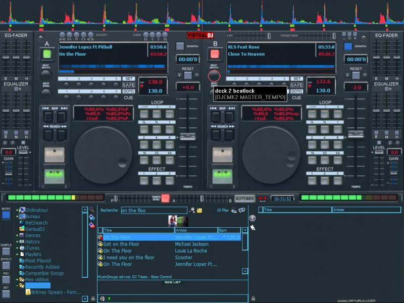 Bref, maintenant que ma transition est prête, je vais me caler à peu de chose près à 131,3 Bpm. La platine A touche à sa fin, je fais ma transition avec ou sans la boucle et ma platine B est part. On the Floor est terminé. Le BeatMatch / BeatLock de la platine B est toujours activé :