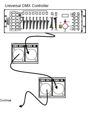 effectivement, pour le branchement tu dois te brancher de la console dmx vers ta première lumière sur la prise input puis sortir de cette lumière de la sortie output vers la deuxième lumière en input, ect...