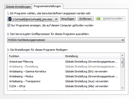 Aber nach beenden von VDJ und Neustart von VDJ ist wieder die Intel-Karte aktiv, ich kann dann die NVidia nicht anwählen.