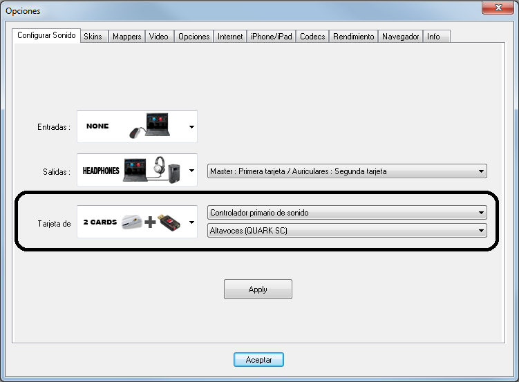 En este caso tienes que seleccionar 2 Targetas (2 cards). Fijate en la imagen y copia la configuracion de Salidas y de Targeta: