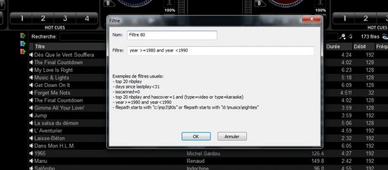 Je voudrais utiliser le dossier filtre (icone bleu) pour que vdj me donne seulement les titres des années 80, mais dans la boite de dialogue dans la zone "filtre", quelque soit la touche du clavier que j'utilise, j'ai un message d'anomalie du type 'erreur de syntaxe'. Est-ce que quelqu'un peut me donner la bonne formule pour que cela foctionne SVP.