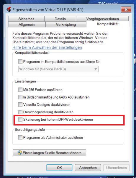 Mit Rechtsklick auf die VDJ.exe Datei (i.d.R auf dem Desktop) und die Eigenschaften aufrufen. Im Kontext- Menü "Kompatibilität" einen Haken bei "Skalierung bei hohem DPI-Wert deaktivieren" setzen. Das wars! Jetzt ist der Skin in der Auflösung wie auf dem Desktop.