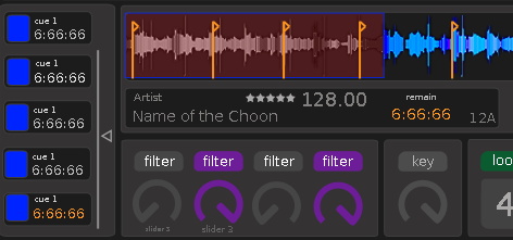another great addition for skins although really done with vdjscript would be able to query whether a cue had been passed or not, or better yet if it was next in the timeline, then use the answer to change a pannel in a skin... so for this example the track has passed the first four cues so they display grey... but because the fifth cue is coming up next it is highlighted in orange to make you aware at a glance.