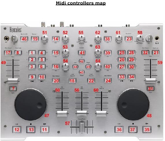 Busco el mapping para controlar los decks 3 & 4 con los pitch sliders (que se corresponden con los números 49 y 59 en la foto).