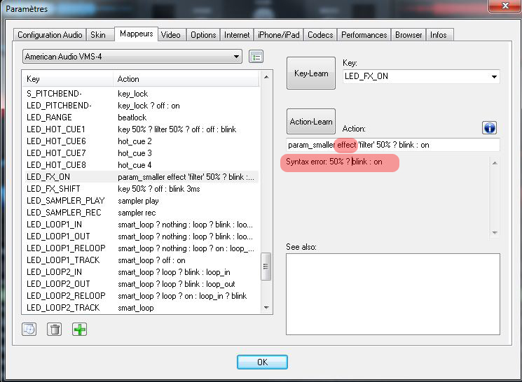 je confirme <map value="LED_SELECT_FX" action="param_smaller filter 50% ? blink : on" /> ne donne rien du tout...