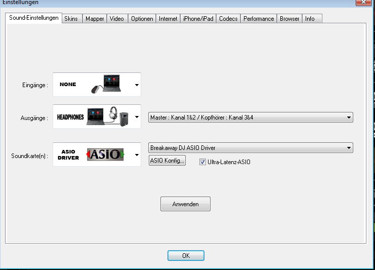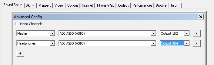 dann geh mal in die advanced config und route da nur den headphone mit 3/4 und das master mit 1/2 mit bw , mehr nicht routen