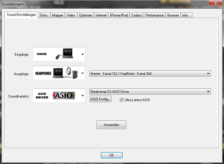 - Bei den Soundeinstellungen von VDJ Eingänge: NONE...Ausgänge: MASTER/ HEADPHONES und als Soundkarte die ASIO Treiber von BDJ