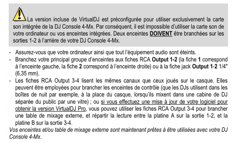 avec la version pro la sortie 1/2 pour la platine 1 et la sortie 3/4 pour la platine 2 ... ça revient à un branchement de lecteurs CD, pour partir sur une autre table de mixage et mixer sur celle-ci.
