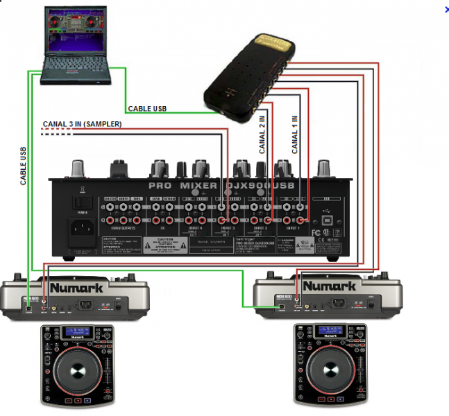 Exact, j'ai mis le câblage pour le midi et le timecode. J'ai juste oublié de mettre les deux câbles en Y qui vont des ndx vers les entrées 3 et 4 de la table afin d'utiliser les ndx sans ordi (en cas de plantage de vdj), ce qui fait 3 modes
