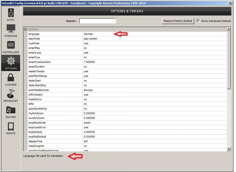 Mein kleines Problem ist folgendes. Ich habe mir wohl aus einem VDJ Backupordner (1 Tag alt) eine veraltete Information gezogen, die mir nun in den Optionen bei eingestellter deutscher Sprache eine englische Erklärung liefert. Aus welcher build der Backupordner ist, weiß ich nicht mehr.