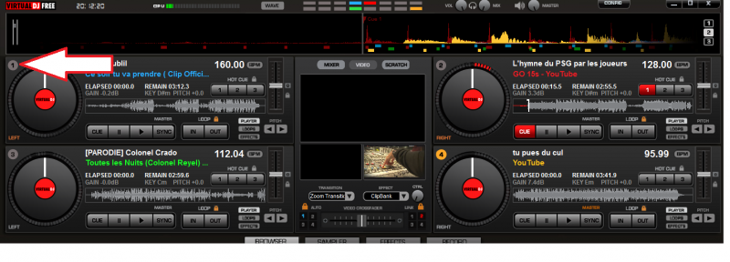 Il vous suffit de tous les avoir à zéro et d'ouvrir uniquement celui que l'on doit entendre, vice versa lors d'un changement de deck, on diminue celui qui joue tout en augmentant celui que l'on vient de lancer, mais, oui il y a un mais, ceci n'est pas très commode en utilisant que la souris et le clavier (sans contrôleur, table de mixage, etc.)