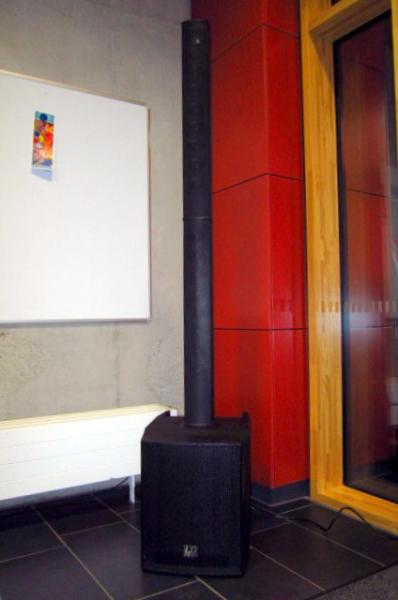 Hier nun die Anlage, die im ganzen knapp 2.10 misst, komplett aufgebaut. In den Säulen befinden sich insgesamt 16 Membranlautsprecher, im Kopf er obersten Säule noch zusätzlich ein Hochtontreiberhorn. So sind Stimmen und helle Töne über die Gäste hinweg auch noch in 20 Meter Entfernung gut zu verstehen.