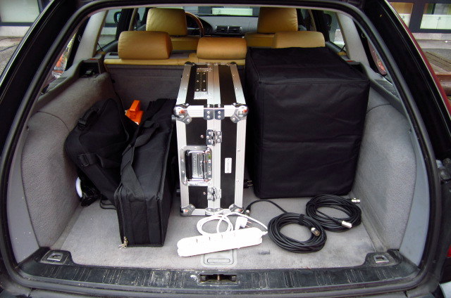 Laptop, Kontrollercase, PA System und Kabel.....und fertig ist die Laube und im Kofferraum noch massig Platz für Licht und Zubehör. Dabei ist die Rückbank noch nicht mal umgeklappt.