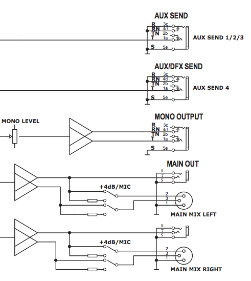 Sur les AUX SEND le R (RING - anneau) et le S (SLEEVE - masse/blindage) sont connectés ensemble à la masse, tout comme les sorties MAIN en JACK, donc asymetriques puisque pas de point chaud et point froid