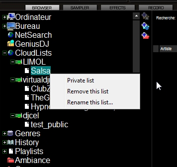 Il suffit de m'ajouter "djcel" en tant qu'utilisateur au niveau de l'icone "CloudLists" (dans le browser de VirtualDJ, à gauche, en faisant un click droit) .