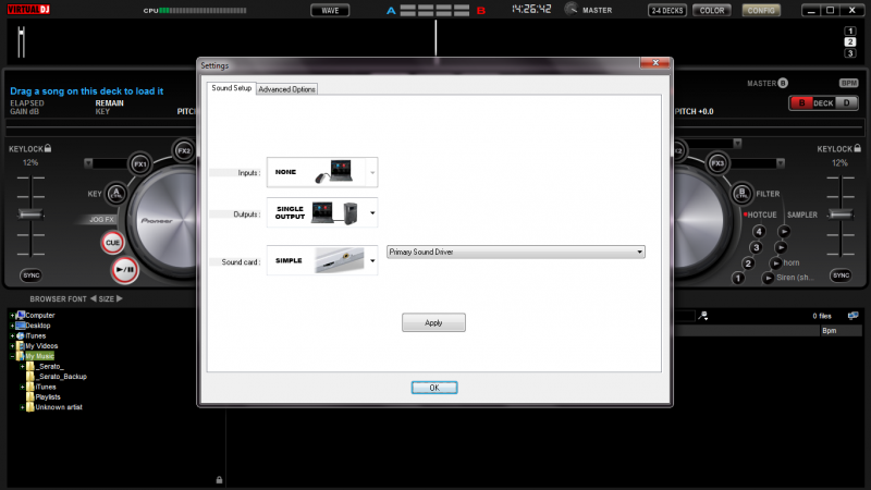Just installed vdj le and set up my wego. the only problem i am having now is sound cueing in my head phones. i understand how to change the settings in config normally but when i click config i dont have the option to change settings. all it gives me is the advanced options tab. why do i not have the ability to adjust my sound settings and how do i fix? thanks