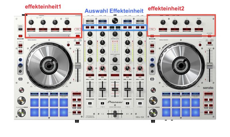 Dort kannst du über die FX Einheiten jeweils einmal den FX Bereich 1 und dann den FX Bereich 2 Steuern und wenn du FX 1 oder 2 Drückst den jeweiligen FX Bereich aktivieren für das Deck, also 1 oder 2.
