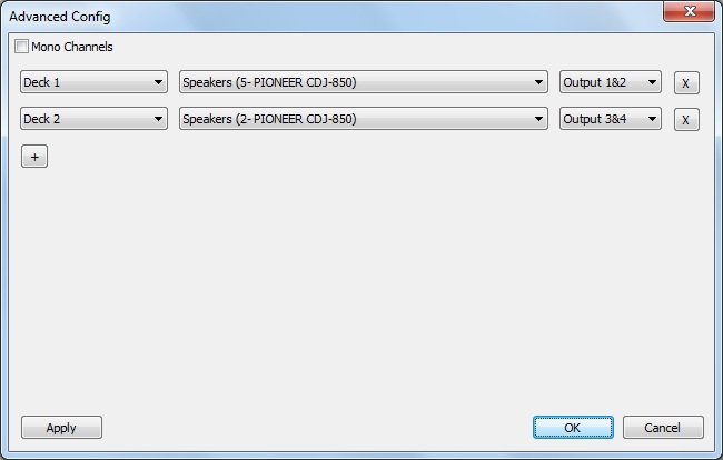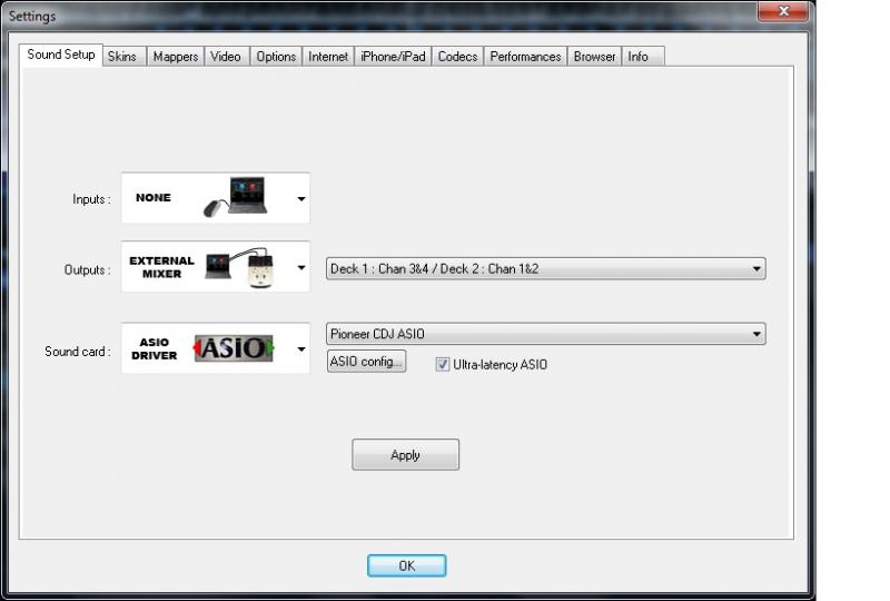 Also - you can set the soundcards as you want, bearing in mind that the soundcard names assigned by Windows (which Virtual DJ uses) don't necessarily reflect which one is left or right. You can only check this 'live', so be prepared. I use the '2 soundcards' option and select the different Pioneer CDJ's as different soundcards. You can quickly swap them around and click 'Apply' if they are outputting sound on the wrong sides.