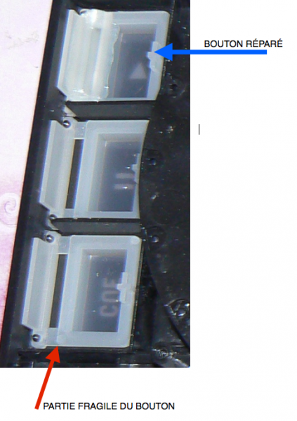 Toujours est-il, faites attention aux boutons PLAY / CUE / PAUSE du Mixdeck, une fine épaisseur de plastique fait office de "charnière" et c'est elle qui a laché, des deux cotés sur un deck, d'un seul sur le deuxième.
