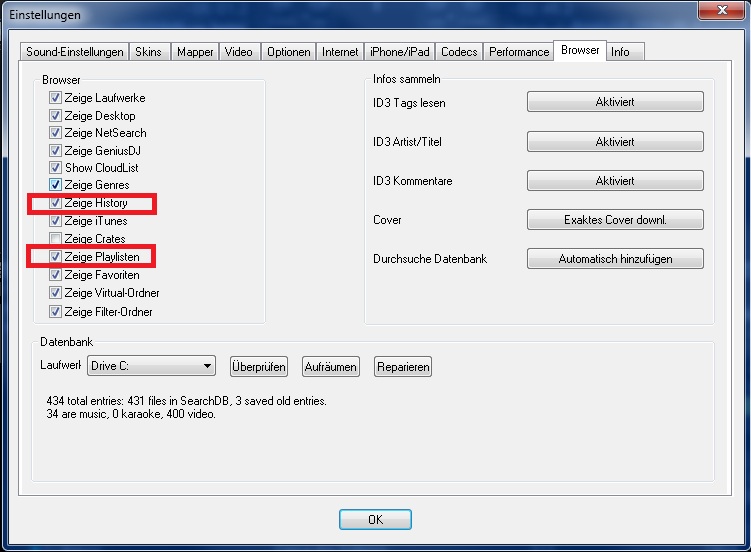 Und dann sind History und Playlists zu sehen Rechts im Browser von VirtualDJ.