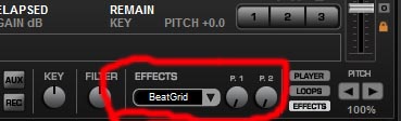- Effect Bar - 4 Regler in der Mitte sind mit dem FILTER für das jeweilige Deck gemappt. Der Button darunter aktiviert BEATGRID