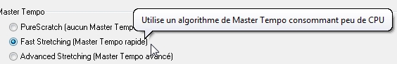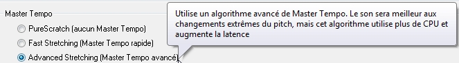 Avancced Stretching (Master tempo avancé) - appliquer en temps réel / meilleure qualité de time-stretching algorithme où la qualité est meilleure sur les changements de hauteur extrêmes au détriment d'une utilisation légèrement plus élevé de la puissance du processeur