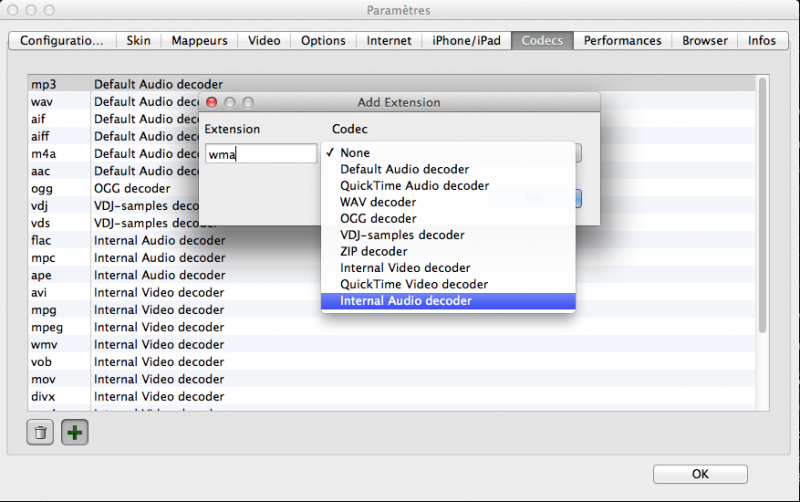 Appuyer sur le + pour ajouter une extention, ajouter "wma" et choisir "Internal Audio Decoder"