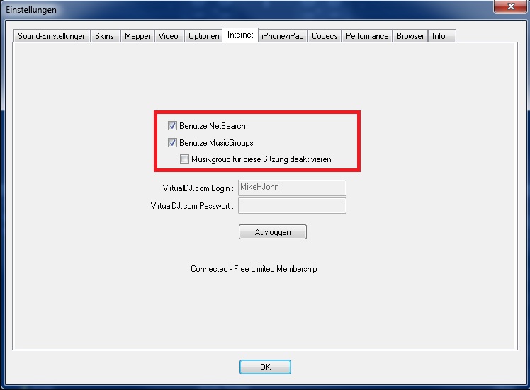 Ist Musikgroup für diese Sitzung deaktivieren markiert, so wird auch nichts zum Server gesandt oder in Datei Namens ToUploadForMusicGroup.vdjsend reingeschrieben.