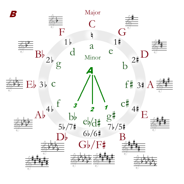 mineur (m) : 9A => 4A => 11A => 6A => 1A => 8A => 3A => 10A => 5A => 12A => 7A => 2A => 9A