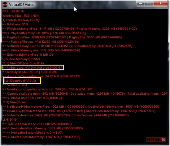 lance vdj puis active le plugin FPS qui se trouve dans l'onglet (video effet) de vdj, dans la fenêtre video affiche tout les infos