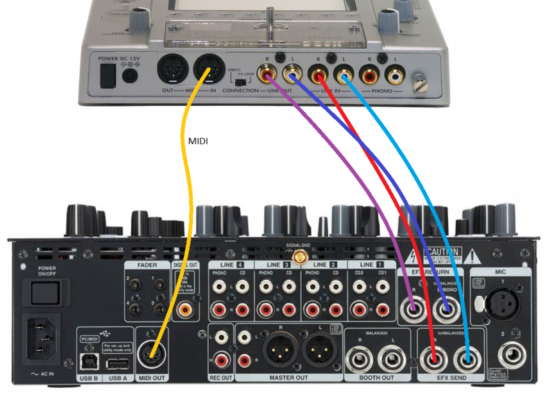 Dazu noch ein MIDI kabel, falls dein mixer das ausgeben von MIDIClock unterstützt und einen anschluss hat.