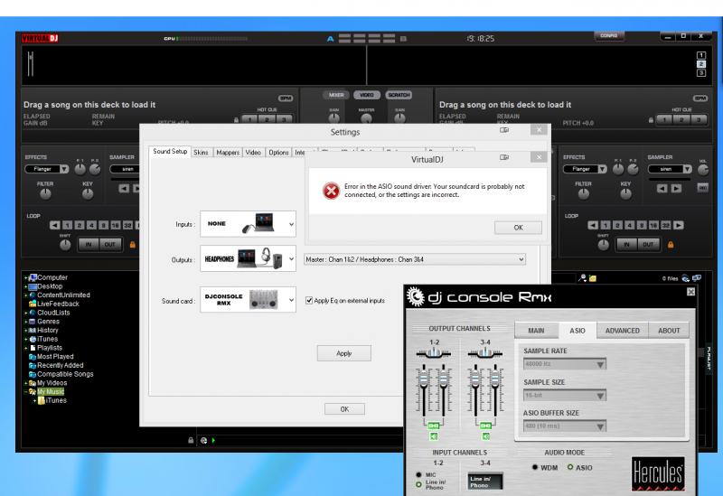 When I choose ASIO in the Hercules settings and then switch to "Hercules DJ Console RMX ASIO" in VDJ, it comes up with an error code saying