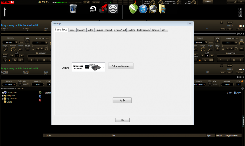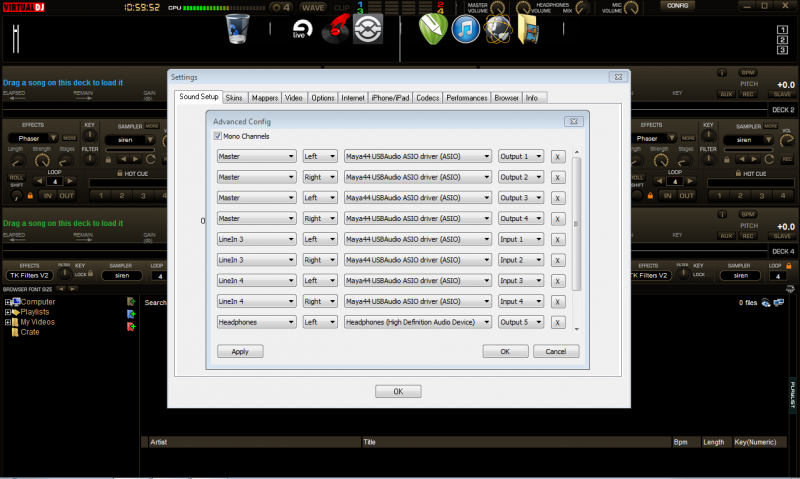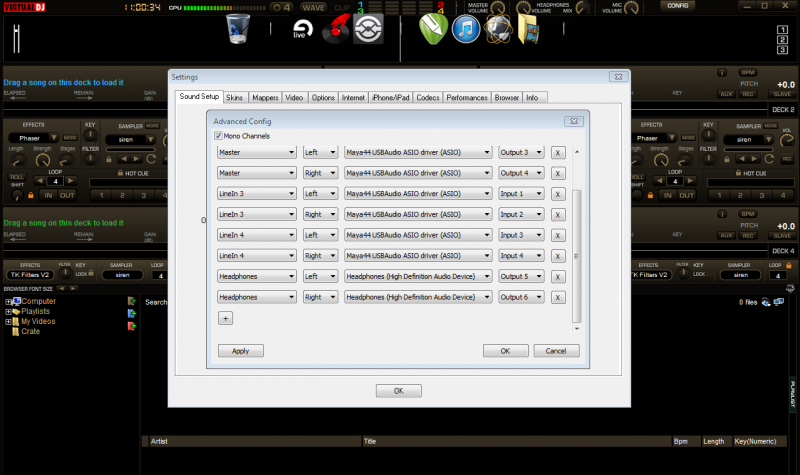 So, basically at the moment I'm not using equipment. I'm running my laptop on 2 different sound cards, internal card with asio4all for my headphones, Maya for main output to monitors. Everything works for the most part well, except if I load a song on a deck or after play for a bit my headphones can start to crackle. And also not always, but sometimes the CPU level reaches red and that will also make them crackle. Usually I will go into the settings and uncheck or check e.g equalization or bass etc... And that will reset my headphones, needless to say it's annoying.