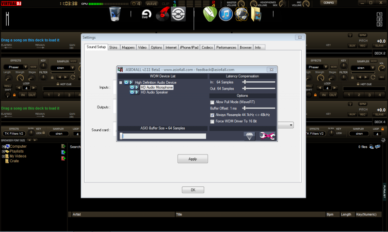 I removed asio4all really didn't make any difference. I'll load a song on a deck, sometimes I won't play it right away. I might leave it there for a while before I play it and everytime, it will crack in my headphones. Another way will be if I'm playing and song and then I load another one and the cpu will go into the red and it will crack then too.