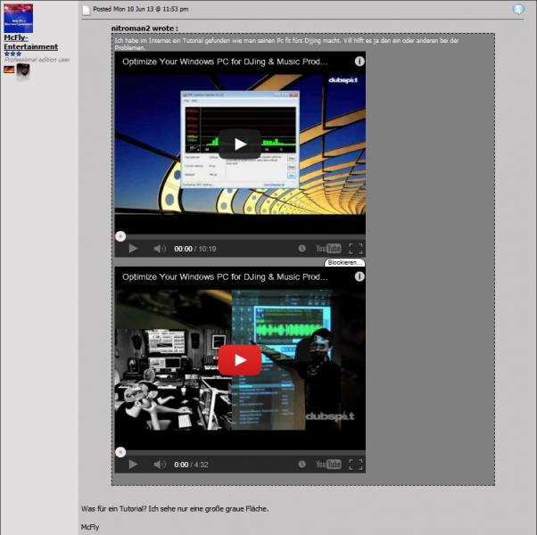 McFly-Entertainment wrote :Was für ein Tutorial? Ich sehe nur eine große graue Fläche.McFlyDann hast Du evtl. keinen akt. Flashplayer installiert ? Das sind 2 mit Flash eingebundene Videos.Gruß, Heiko