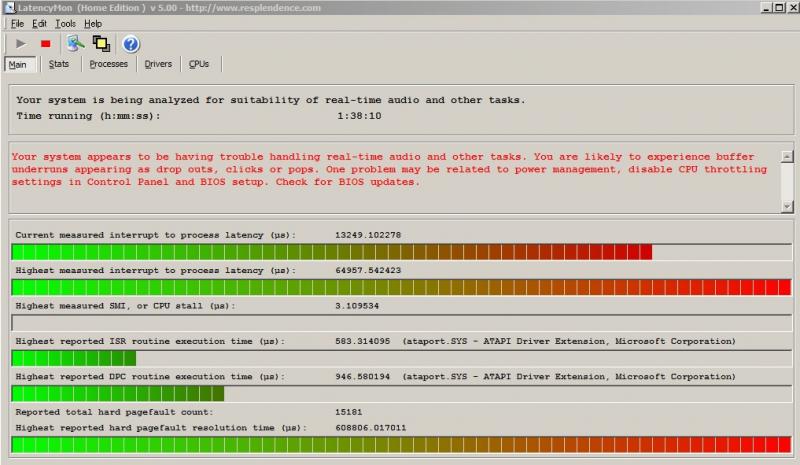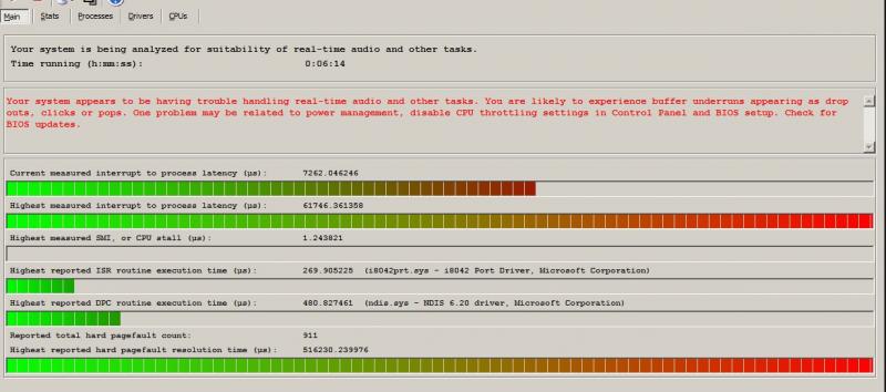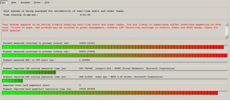 The upper line "current measured interrupt to process latency" is constantly going all the way up and it hangs at least 1/2 way. I also have that message listed in red. Not sure what all this means and how to correct it so I'm looking for ideas.