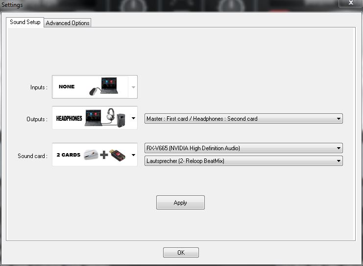 Seit heute bin ich im Besitz eines Reloop BeatMix. Ich habe das beigelegte VirtualDj LE installiert und wollte das Programm so konfigurieren, dass ich das Kopfhöhrer-Signal aus dem Reloop BeatMix bekomme und das Master-Signal aus meinem AV-Receiver, der per HDMI mit dem PC verbunden ist. Dies kann man zwar einstellen, nur bewirkt ein Klick auf Apply und Ok nichts. Wenn ich die Einstellungen wieder aufrufe, ist wieder die Standard-Konfiguration zu sehen. Auch wenn ich das Programm als Admin starte, merkt es sich die Einstellungen nicht.