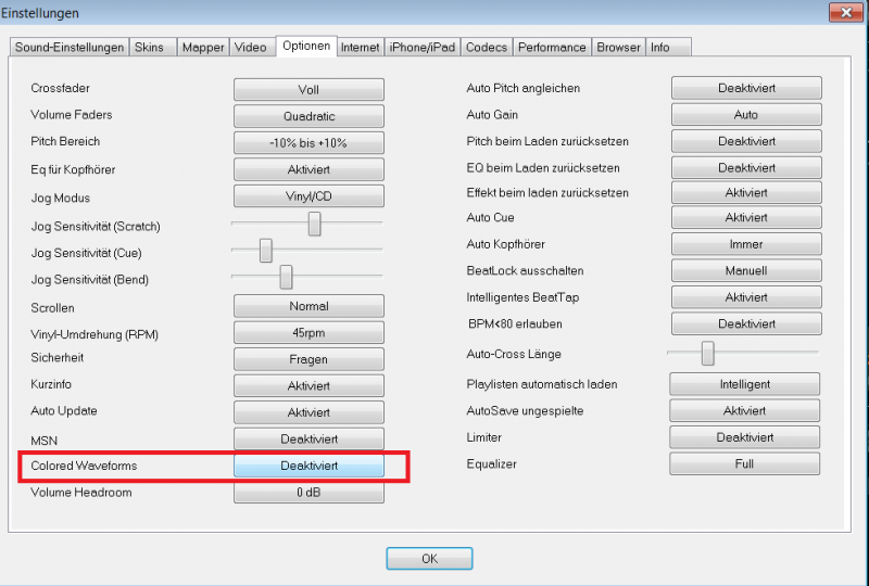 Die Colored Waveforms kannst du unter Config/ Optionen ein/ ausschalten ...hat nix mit dem Skin zu tun....;-)