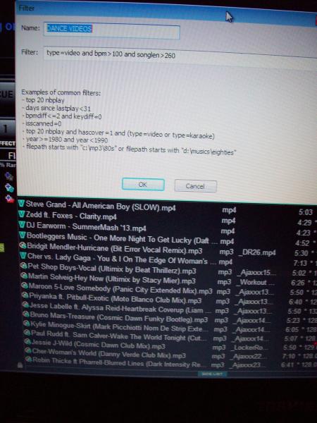 bpm>100 and songlen>250 and (filepath ends with avi or filepath ends with mp4 or filepath ends with flv)