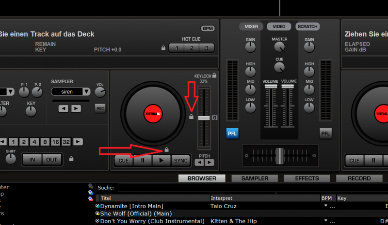 Wann immer ein neuer Track in den Player gezogen wird, passt VDJ automatisch den Pitch-Regler an. Wir haben